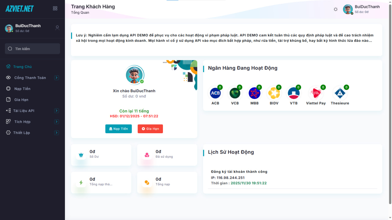 bảo hành api 15 ngày và từ lần sau khi api bank update chúng tôi sẽ thu 100k tùy ngân hàng để update api bank của ngân hàng đó hoặc bạn có thể mua api bên ngoài tự code vào